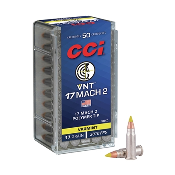CCI 17 Hornady Mach 2 Ammo 17 Grain Varmint VNT Polymer Tip ammo review offers the following information; Delivering an explosive and accurate performance over and over again with incredibly reliable ammunition is what CCI Ammunition is known for among hunters and target shooters alike! For over 50 years shooters have counted on CCI for all of their rimfire ammunition needs, and CCI has always delivered. This CCI 17 HM2 features a 17 grain polymer tipped V-Max bullet which allows it to be 60% faster than a 22 Long Rifle round. One look is all it takes to know that CCI understands what varmint hunters desire. The Varmint Ammunition line features a variety of bullet technologies that are designed for the same goal: total devastation on impact.